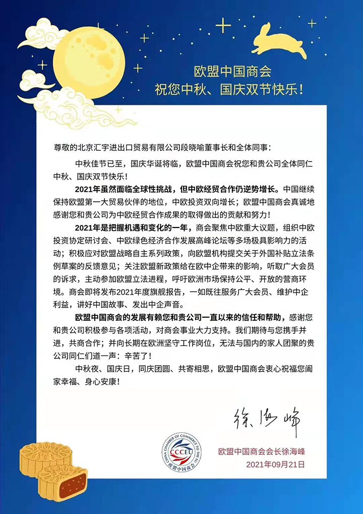 歐盟中國商會祝北京匯宇進出口貿(mào)易有限公司全